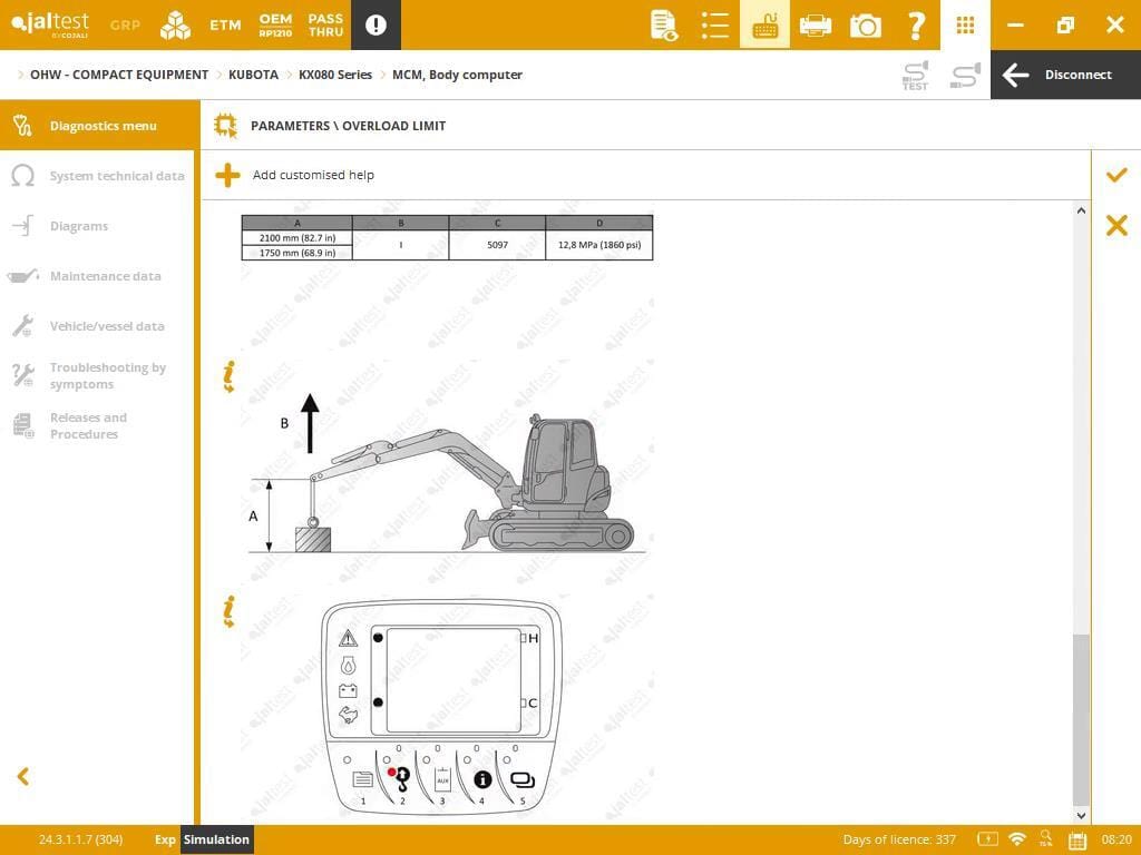 Les informations techniques sont accessibles depuis le menu de diagnostic. Celles-ci incluent les données techniques du système, des schémas de câblage détaillés, l'entretien et toutes les données du véhicule, les mises à jour et procédures, et très important, les guides de remplacement des composants. Pour chaque paramètre, vous obtenez une mine d'informations sur votre équipement OHW Kubota, telles que le scan du moteur, l'étalonnage hydraulique, et d'autres.
