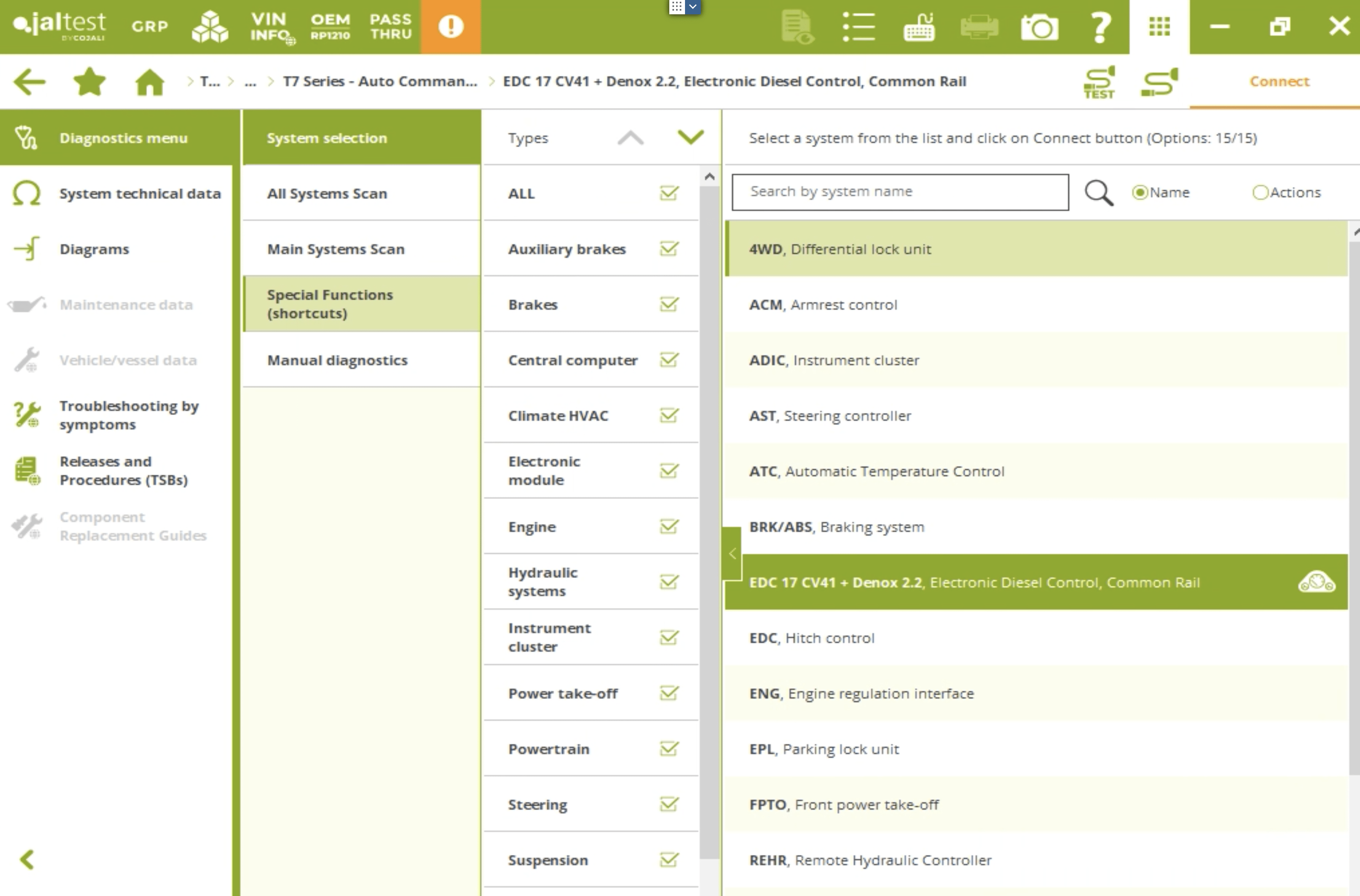 L'outil de diagnostic Jaltest New Holland offre une couverture approfondie de votre équipement agricole New Holland. Tous les composants et pièces sont couverts par notre logiciel, y compris les moteurs, l'hydraulique, l'ordinateur central et les transmissions, et vous obtenez des solutions aux problèmes le plus tôt possible. En plus des régénérations forcées et des injecteurs de code, vous pouvez également effectuer des procédures complexes telles que l'étalonnage et le dépannage des transmissions, de la prise de force, de la suspension, de la direction, de l'attelage arrière, et d'autres.