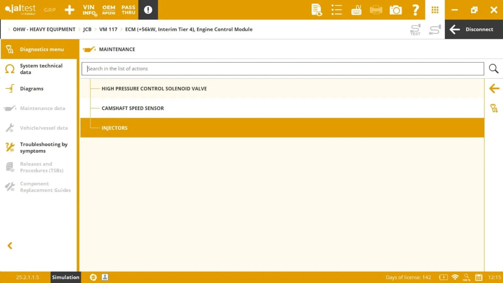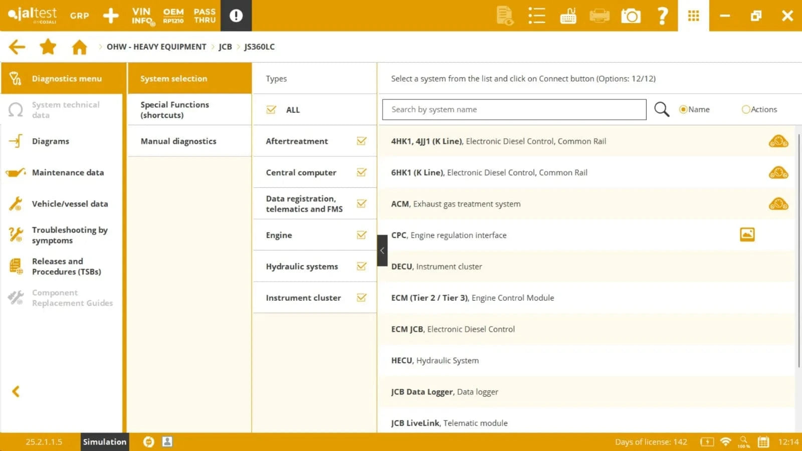 The Jaltest JCB diagnostic software has a very user-friendly menu that guides you effortlessly through fault clearance activities. You will get options such as Diagrams, Maintenance data, Vehicle data, troubleshooting by symptoms, and more. In the subsequent System Selection, select either Special Functions or Manual diagnostics.